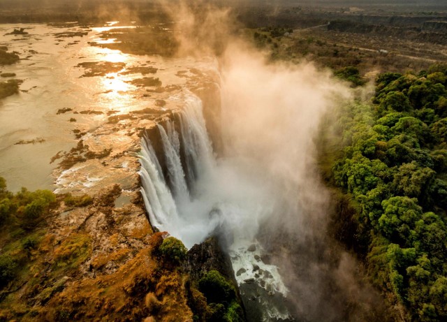 今日續停留在『Victoria Falls River Lodge』私人豪華營地。於一早天將明亮時分在專業狩獵嚮導的帶領下搭乘敞篷狩獵車穿梭於Zambezi 野生動物保護區開始我們的野生動物尋奇之旅。早餐後,驅車前往參觀維多利亞大瀑布。蘇格蘭傳教士李文斯頓(David Livingstone)於1855年11月16日發現並以當時的英皇『Victoria Elizabeth』世之名命之。 維多利亞瀑布位於辛巴威(Zimbabwe)和尚比亞(Zambia)邊界的尚比西河(Zambezi river)上, 是世界三大瀑布中最為雄偉壯闊,每分鐘總落水量世界第一。尚比西河河水從懸崖邊緣傾瀉而下,摔進107公尺深裂縫, 再沿裂縫橫向急去, 發出巨大的響聲. 飛濺的水花並形成霧紗於裂谷邊緣,一幅寬1703公尺大型水幕就出現眼前. 當地馬可魯魯 (Makololu)稱之為「Mosi-Oa-Tunya」,意為「The Smoke That Thunders」,打雷的煙霧。午後安排搭乘★河船淌漾於尚比西河並欣賞非洲大地的落日餘輝。