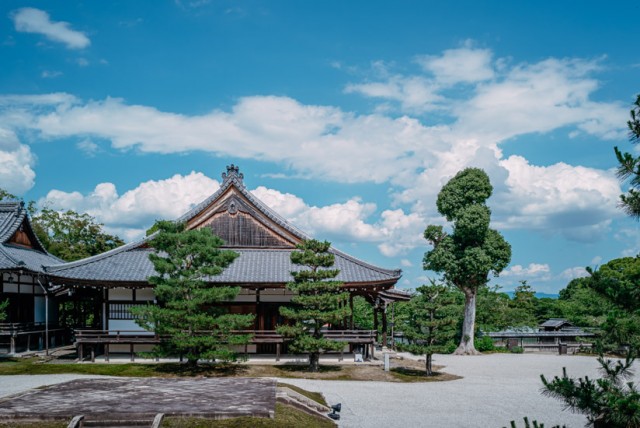 大覺寺的起源是嵯峨天皇在此地建造的離宮「嵯峨院」。歷代天皇和皇族擔任住持,成為門跡寺院,被稱為「嵯峨御所」。也是「嵯峨御流」花道的發源地和總司所(家元)。值得一看的有畫師狩野山樂在金地上繪製的牡丹圖和紅梅圖等華麗的襖繪。接著是天花板較低以防止揮舞刀槍的鶯張廊「村雨(むらさめ)的走廊」。