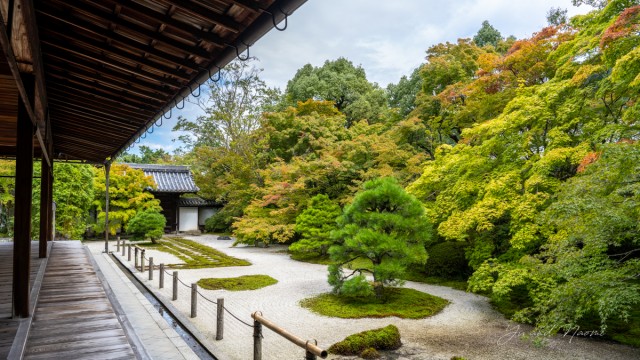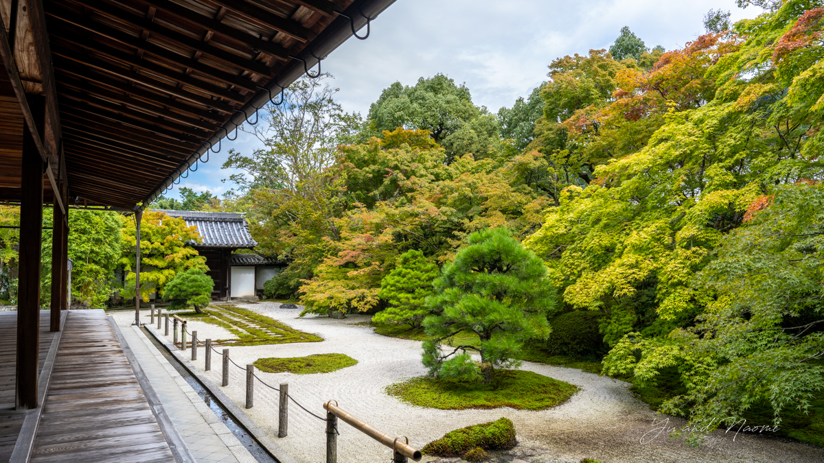 另外也有不少意境幽美雅致的庭園,如位於大方丈的禪院式枯山水庭園「虎子渡河」(虎の児渡し)(名勝)以及位於金地院的枯山水庭園「鶴龜庭」(鶴亀の庭)(特別名勝)。鶴龜庭的仙鶴與烏龜是用樹木以及石頭表現,優雅的日式庭院風情令人內心如湖水般一片平靜。