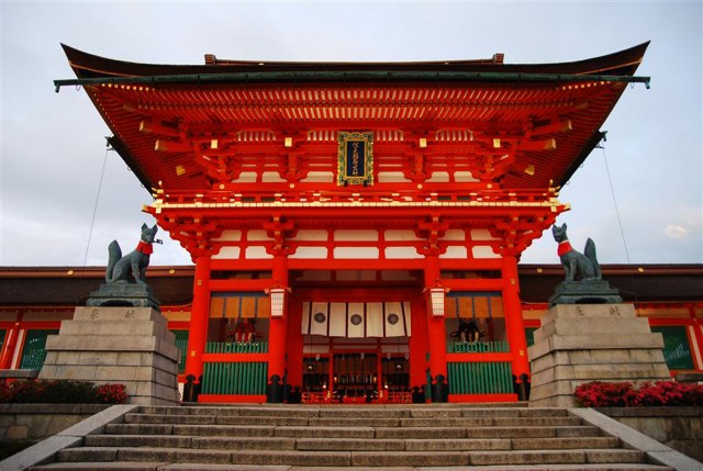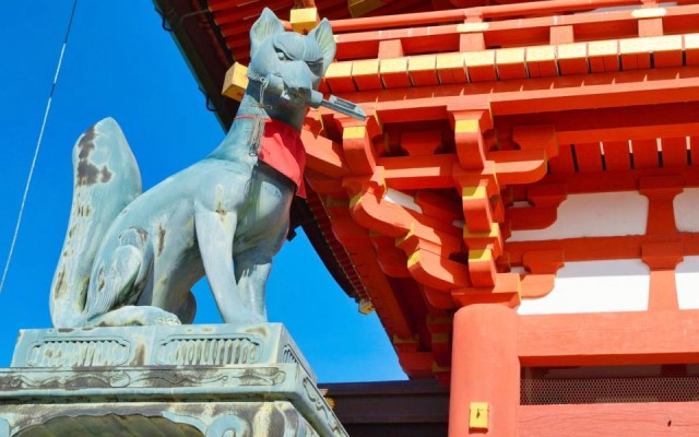 位於伏見的★稻荷大社是全日本4萬多座稻荷神社的總本宮。日本人從很久以前就相信狐狸是介於人與神之間的使者,能夠保佑五穀豐收及風調雨順,所以可說是農民的守護神之一 。稻荷大社的門口放置一對狐狸石像,右邊的狐狸嘴裡叼的是寶珠,左邊的則是叼著一把鑰匙,與一般神社大不相同。
