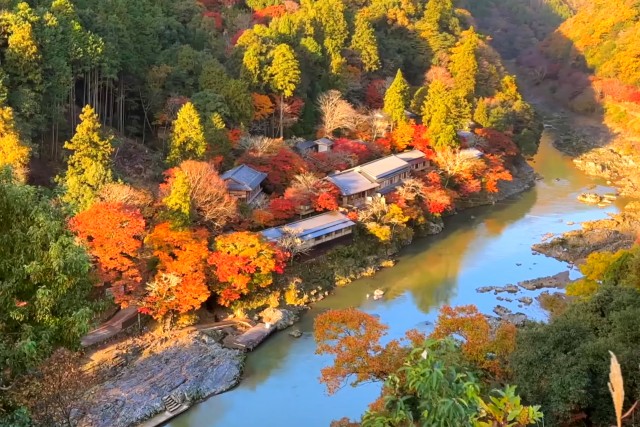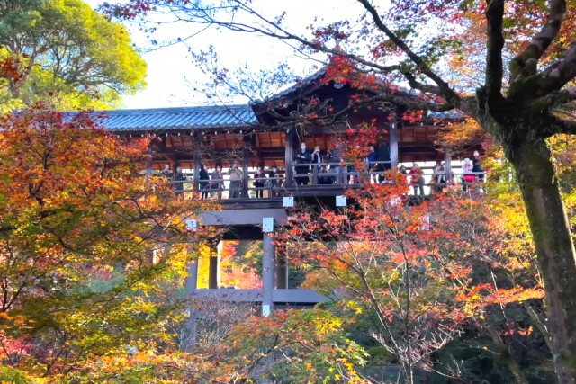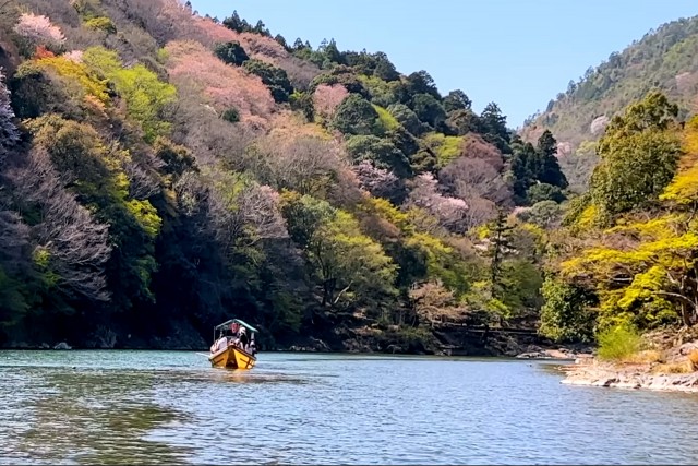 渡月橋別名嵐橋,春天櫻花、秋日紅葉,美景倒映在大堰川上,美不勝收。染上一層鮮豔紅色的渡月橋融入嵐山景緻,風景秀麗,成為代表京都的明媚景色,吸引許多旅客造訪。