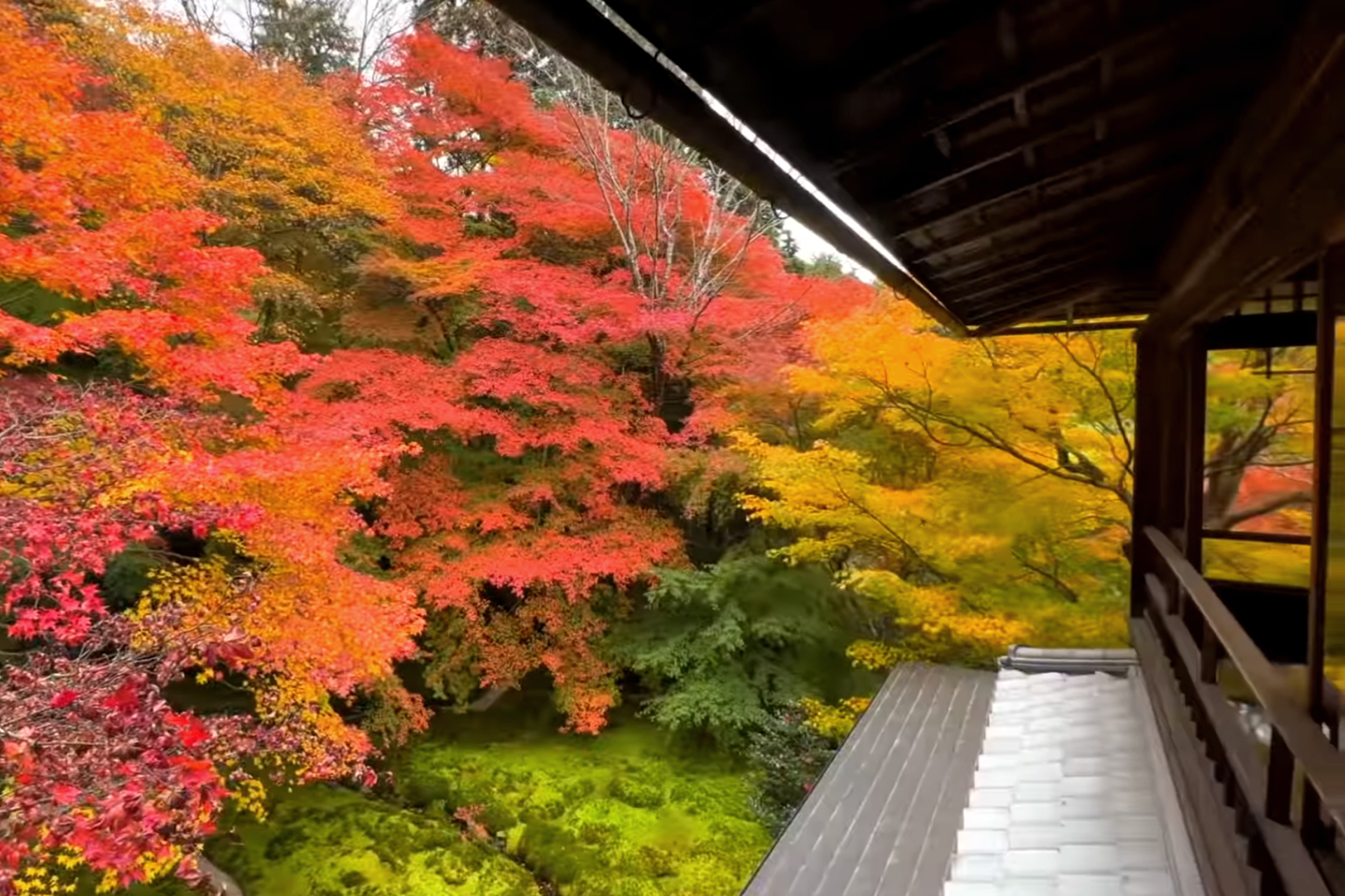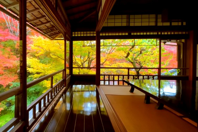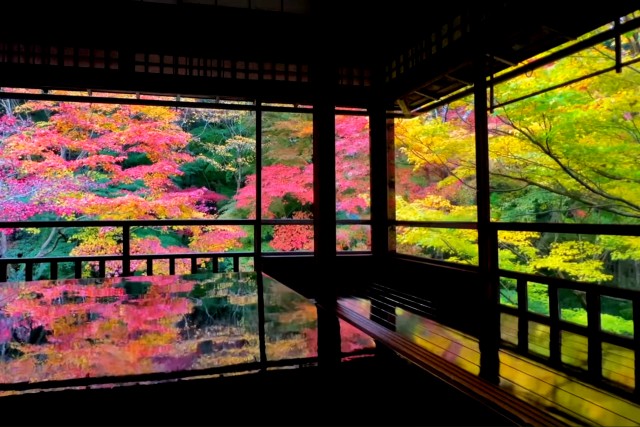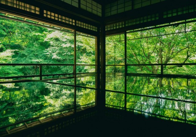 位於京都東北方比叡山麓的瑠璃光院是秋天賞楓勝地,但春天至初夏的青楓美景也令人心醉。遊客在拍攝美景時大多能彼此禮讓,維持環境的清幽。在池上的小橋可觀賞錦鯉悠游,再走幾步就可進入數寄屋造(日式建築方式之一)的書院,走上2樓,映入眼簾的翠綠的青楓美景,窗外的青楓與映在室內黑漆寫經桌的青楓倒影,相互輝映,綠意盎然。