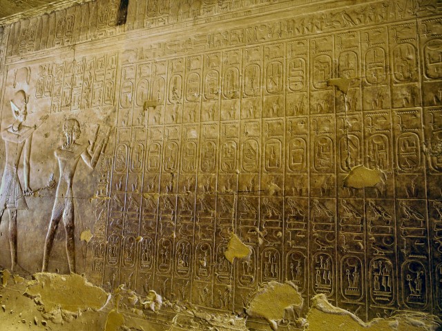 早上抵達獅子谷,這裡也是有三座遷移過來重組的神殿群。1960年到1970年間,國際間著名的古蹟搶救行動,在埃及努比亞地區大肆進行。瓦迪-薩波瓦位於尼羅河西岸,阿斯旺南方約150公里,和達卡神殿一樣,在建造阿斯旺大壩期間,神殿由原本的地點往西移動了4公里。★薩波瓦神殿又因為有整排獅身人面像大道直達神殿前庭,也被稱之為獅子谷,屬於新王國時期建造的石鑿神殿,最先由法老王阿蒙霍泰普三世建造,但經歷了阿肯那頓法老王統治時期的一神信仰,去除了原本神殿內崇敬的太陽神阿蒙壁畫,後來才又由法老王拉美西斯二世重新擴殿整建。到了西元5世紀左右,基督教的傳入,將部份薩波瓦神殿內部浮雕以石膏覆蓋,改繪基督信仰和聖人的圖像,但也因原本刻有太陽神阿蒙拉和荷魯斯形象的北方之神哈若克堤(代表的是從地平線升起的太陽,日出)的聖船浮雕被覆蓋在石膏下而被完整保存下來。但也因此,神殿內一處原本刻繪著法老王拉美西斯二世向太陽神敬獻鮮花的祭祀場景,變成是獻給聖彼得的景象。
