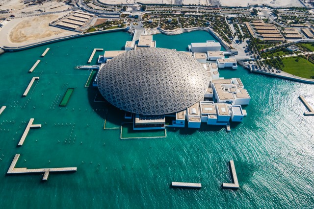 午餐後前往Saadiyat Island (快樂島Island of Happiness)薩迪亞特文化區Saadiyat Cultural District Abu Dhabi參觀2017/11/11開幕的★羅浮宮Louvre Abu Dhabi阿布達比分館參觀,此棟博物館設計師Jean Nouvel在沙漠國家中建造出的唯美建築,閃耀文化之美。除了豐富的展覽作品外,另可欣賞其建築美學。