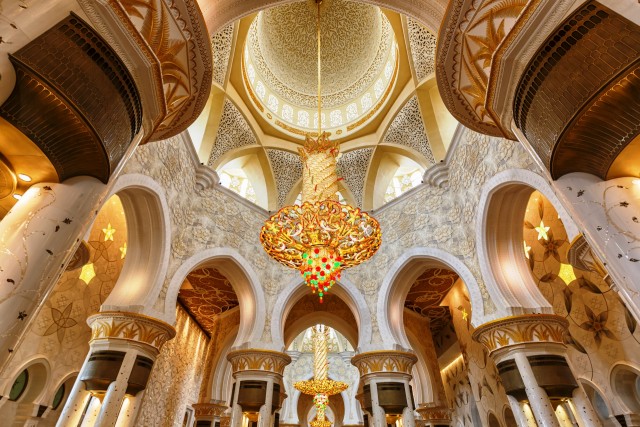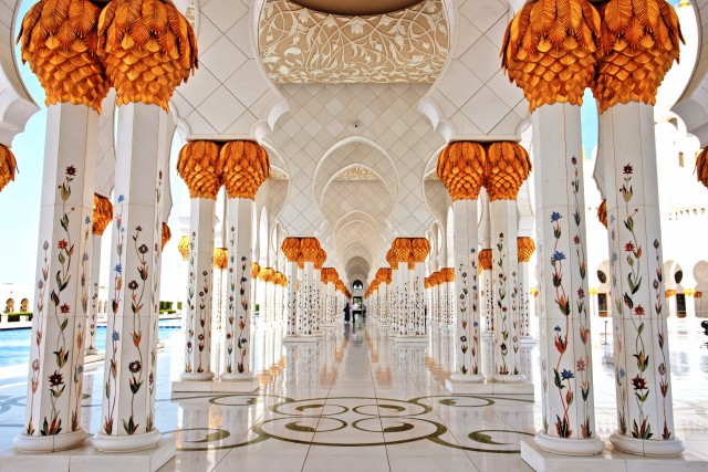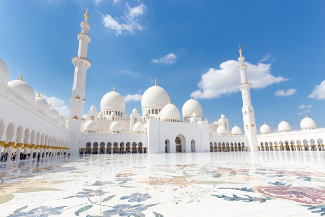 早餐後專車前往阿拉伯聯合大公國首都─阿布達比(車程約1又1/2小時,140公里),約09:00到阿酋開國元首Sheikh Zayed Bin Sultan Al Nahayan名字命名的大清真寺,大廳光亮潔淨,純白的石牆攀滿藤蔓雕花,柔和而細緻,透光的玻璃窗扇和門扉,雕琢著伊斯蘭風情的花樣紋飾;此外還有全世界最大的手織波斯地毯,質地柔軟綿密、色彩繽紛如花草,據說是由伊朗東部的千名婦女花了兩年時間編織而成。