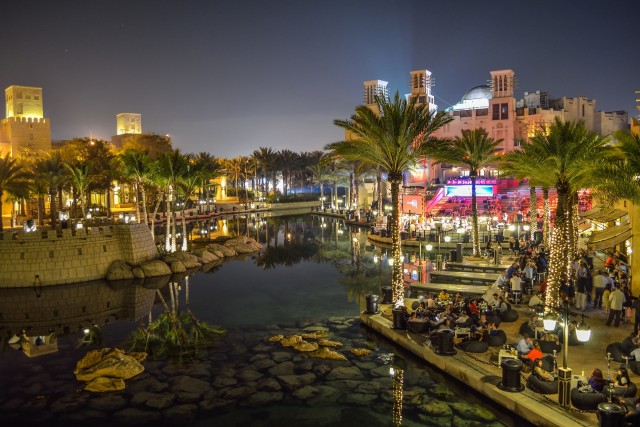 爾後前往★Souk Madinat Jumeirha朱美拉古城市集,該市集又名”杜拜小威尼斯”,有美麗的運河環繞,屬於朱美拉古城飯店的一部份,是唯一開放給非住客的區域,還可看到不遠處的帆船飯店。市集非傳統型露天市場,像是藝廊般豪華、乾淨且有冷氣。內部像是小型迷宮,集合75家賣中東特色手工藝品紀念品的商店,若想購買好品味兼具設計感的阿拉伯風商品,千萬不能錯過這裡。