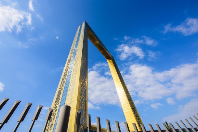 爾後參觀2018年全新建築-★「杜拜之框」The Dubai Frame高150米,寬100米,表面鑲滿金色花紋,在沙漠的陽光下閃閃生輝。建築物內部共分50層,設有一條霓虹燈隧道,引領遊客通往未來展覽館,觀賞有關未來50年阿聯發展的互動展覽。