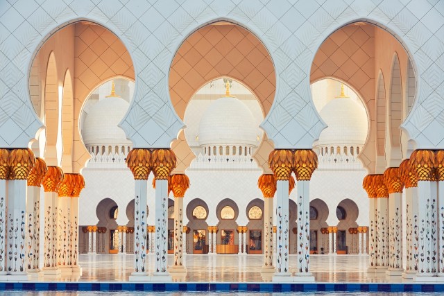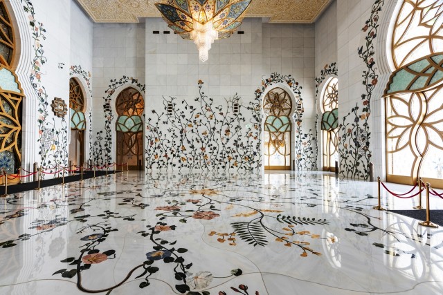 早餐後專車前往阿拉伯聯合大公國首都─阿布達比(車程約1又1/2小時,140公里),約09:00到阿酋開國元首Sheikh Zayed Bin Sultan Al Nahayan名字命名的大清真寺,大廳光亮潔淨,純白的石牆攀滿藤蔓雕花,柔和而細緻,透光的玻璃窗扇和門扉,雕琢著伊斯蘭風情的花樣紋飾;此外還有全世界最大的手織波斯地毯,質地柔軟綿密、色彩繽紛如花草,據說是由伊朗東部的千名婦女花了兩年時間編織而成。
