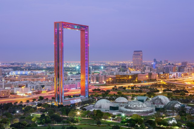 爾後參觀2018年全新建築-★「杜拜之框」The Dubai Frame高150米,寬100米,表面鑲滿金色花紋,在沙漠的陽光下閃閃生輝。建築物內部共分50層,設有一條霓虹燈隧道,引領遊客通往未來展覽館,觀賞有關未來50年阿聯發展的互動展覽。