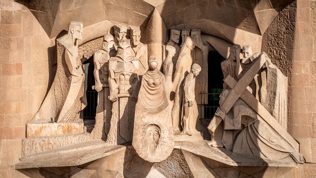 受難立面按照高第於1917年的設計,從1954年開始建造,並於1976年完工。以基督的死亡為主題,其簡樸、憔悴、受折磨的角色而引人矚目,高第為了表現受難的痛苦,設計了有稜有角的現代線條,形似因痛苦繃緊的神經與肋骨。立面包含了包括受鞭刑的耶穌基督、十字架上的耶穌基督。