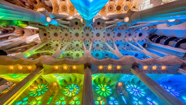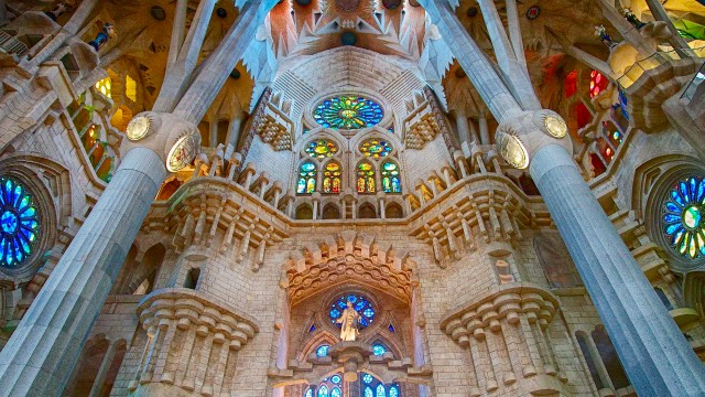 內飾的柱子是獨特的高第設計。 除了支撐其負載的分支外,它們不斷變化的表面是各種幾何形狀交叉的結果。 如:柱子上升時形成八邊形的正方形基底,然後是十六面形狀,最終變成圓形。