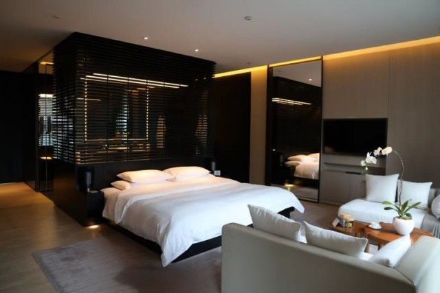 客房以60平方米起跳的寬敞格局為特色,黑白色調搭配深色木質傢俱,盡顯高奢氣質。