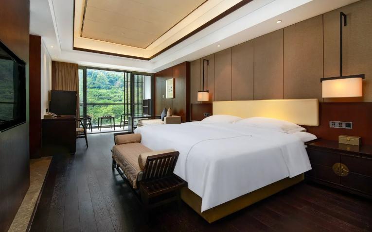 酒店以八卦式佈局呼應“道教發源地”的文化底蘊,大量運用竹材、原木、藤編等天然材料,營造出靜謐靈動的隱世氛圍。