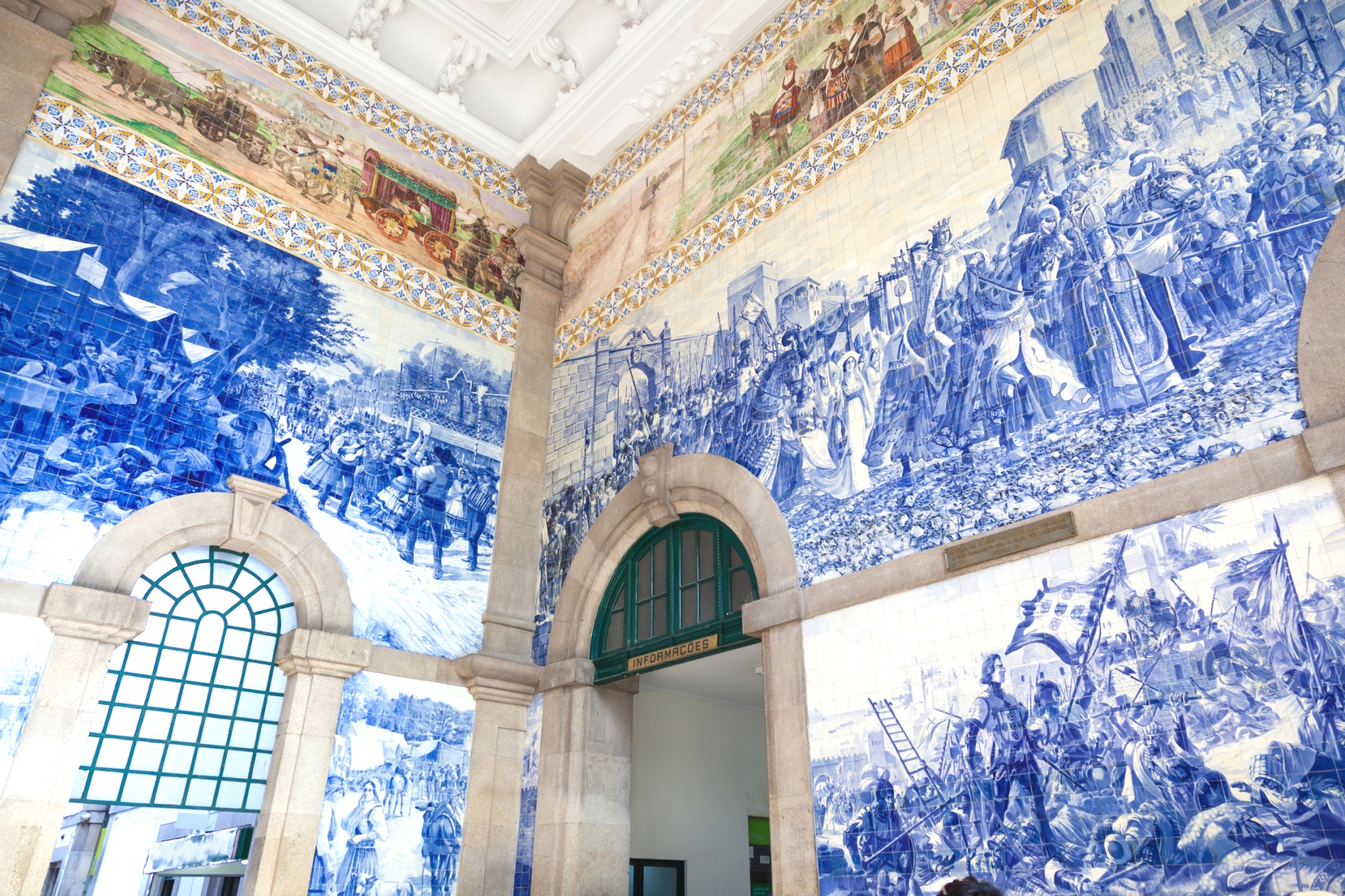 伊比利半島特有的藍白「阿茲勒赫瓷磚畫」,代表地標正是有「世界最美車站」之稱的聖本篤車站,坐擁由2萬片瓷磚打造的絕美空間,也將造訪阿威羅火車站,同樣展現了藍白瓷磚畫的典雅之美。