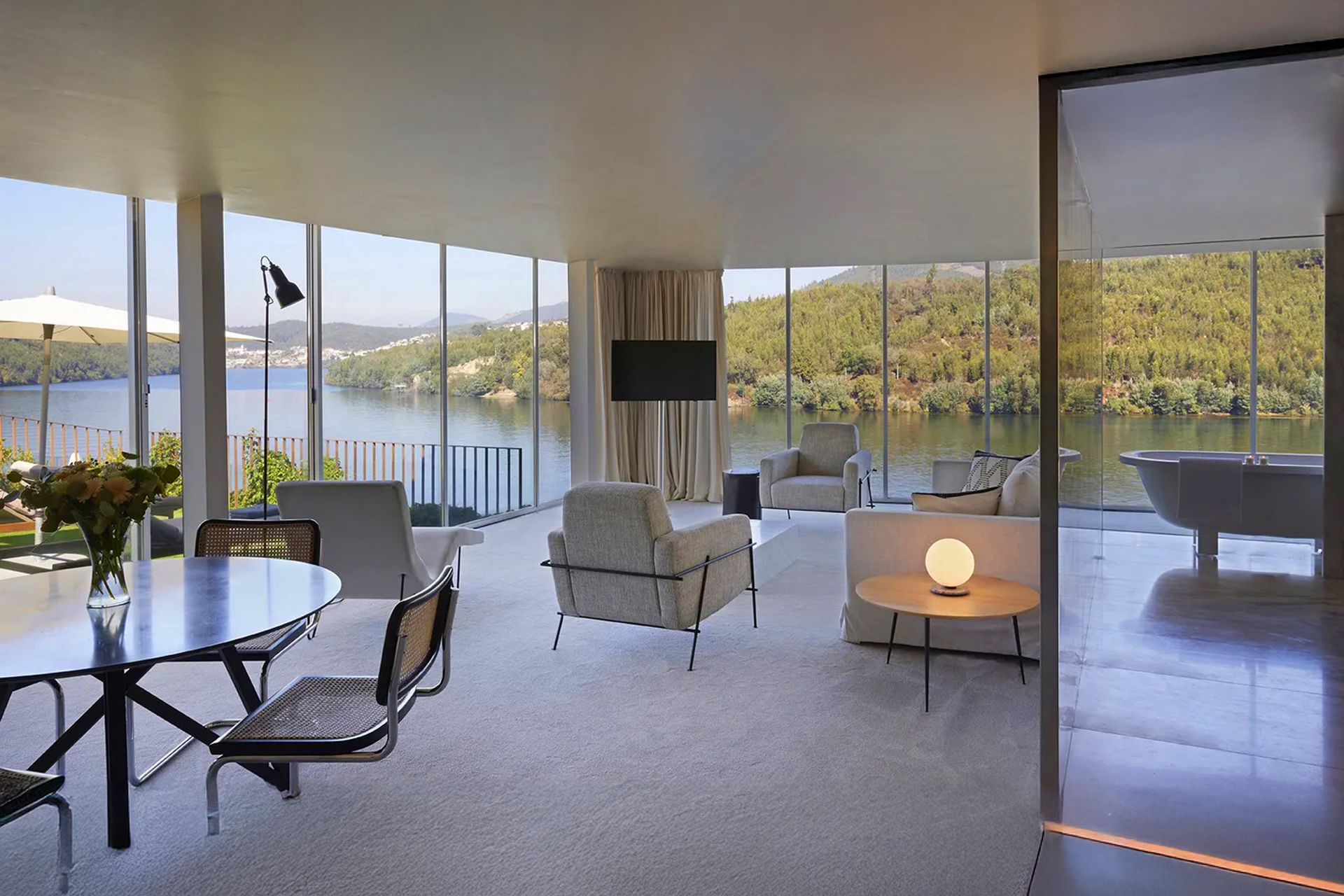 河岸山坡上,源自葡萄園梯田的設計靈感,加上石材與玻璃的運用,Octant雅致地與環境共生共融,彷彿一件「與自然對話的裝置藝術」,客房皆配有盡覽田園風景的陽台或落地窗,另有室外無邊泳池、室內河景泳池與SPA等設施。